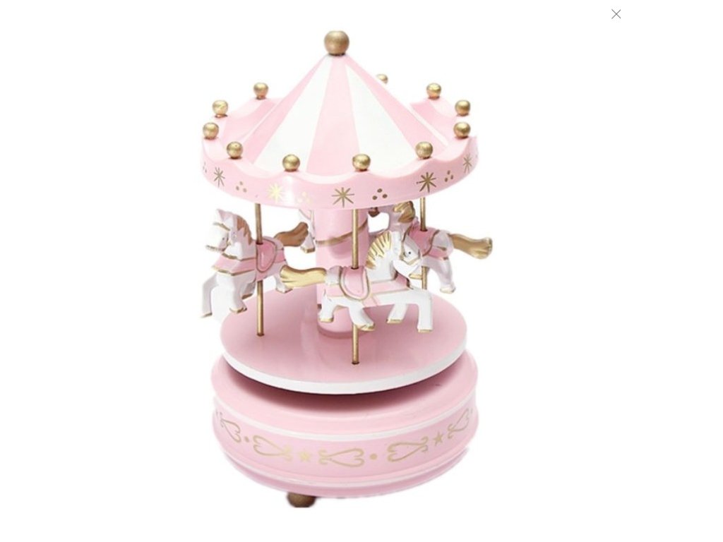 Objevte kouzlo klasického kolotoče s originálním hracím strojkem, který se aktivuje jednoduchým natažením pérka. Natahování je příjemně jemné, takže i malé ručičky si s úkolem snadno poradí. Jakmile se stroj rozběhne, zní z něj jemná melodie a kolotoč pomalu a ladně rotuje, přičemž koníčci na tyčkách se otáčejí kolem své osy, což dodává hře interaktivní kouzlo.