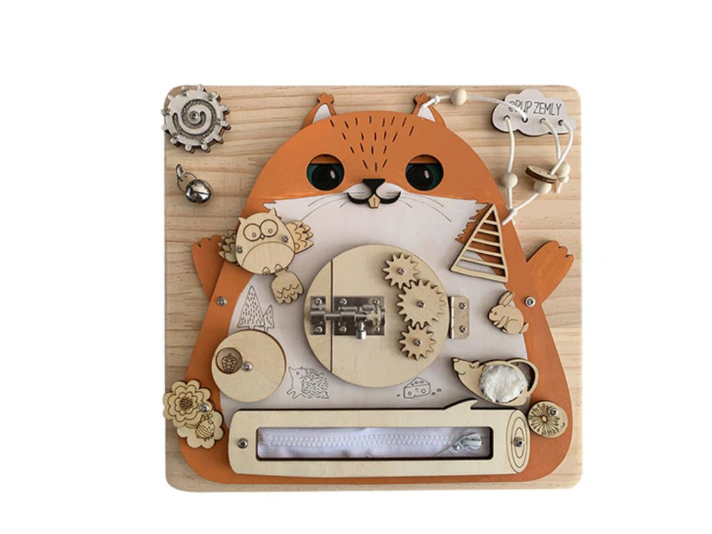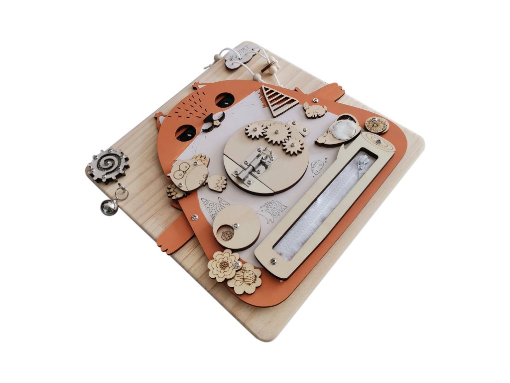 Sensory Busy Board je interaktivní hračka navržená tak, aby stimulovala hmatové vjemy a pomáhala rozvíjet jemné motorické dovednosti a koordinaci ruka-oko. Děti si mohou vyzkoušet zapínání, zapínání, šněrování boty, otáčení kol a další činnosti, které podporují jejich samostatnost a koncentraci. Každý prvek tabule nabízí zábavnou formu učení a zároveň zlepšuje sílu a obratnost prstů.