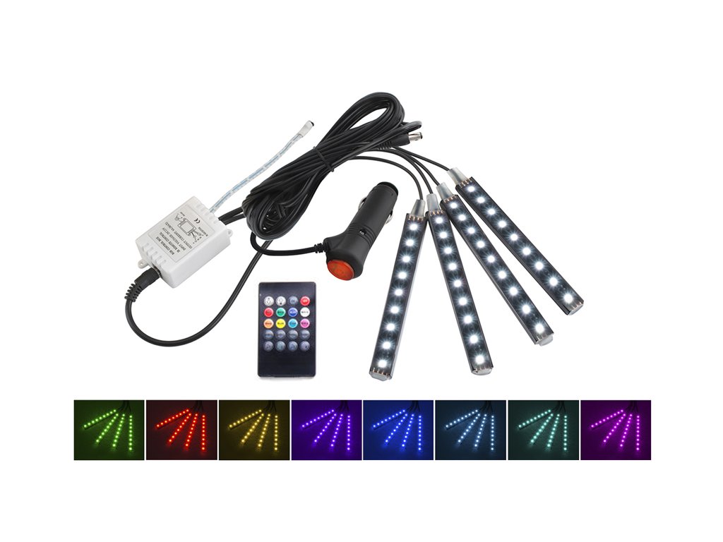 Součástí balení jsou 4x RGB LED pásky, které nabízejí až 8 různých barev a možnost nastavit různé efekty blikání. Díky dálkovému ovládání s 20 tlačítky můžete pohodlně měnit barvy a styly osvětlení podle své nálady a příležitosti. Vytvořte si jedinečnou atmosféru během jízdy nebo parkování.