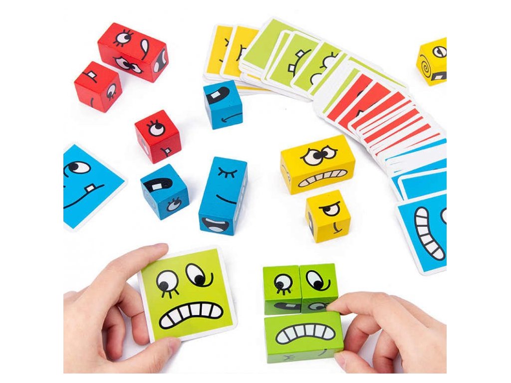 - Kompletní balení – obsahuje 12 barevných dřevěných kostek s výrazy a 50 karet výzev pro rozmanité hry a učení.
