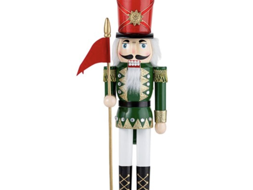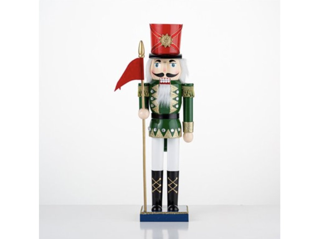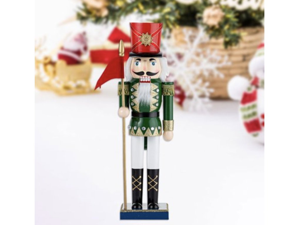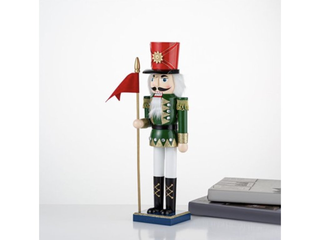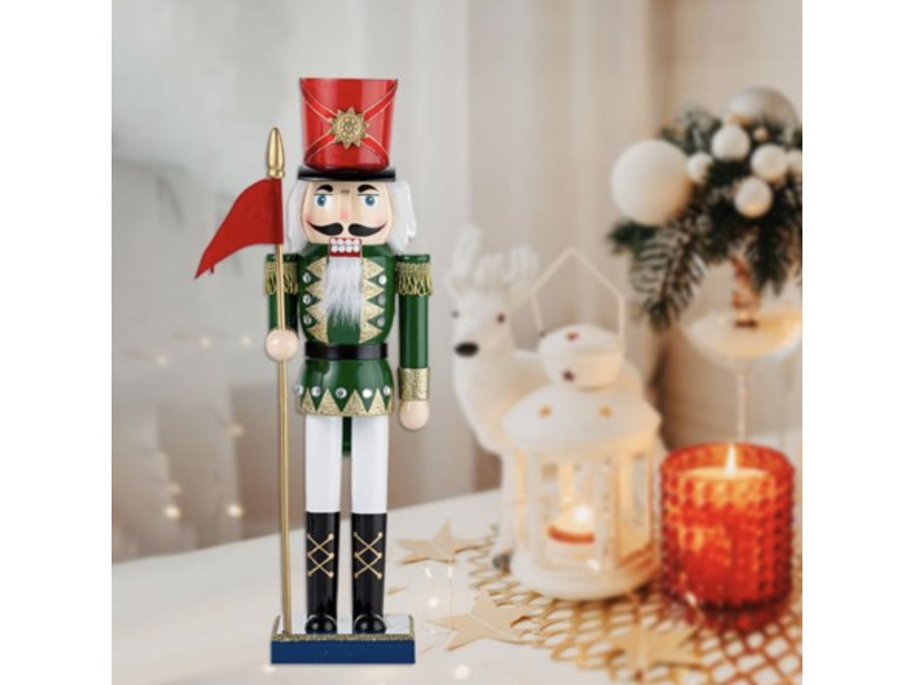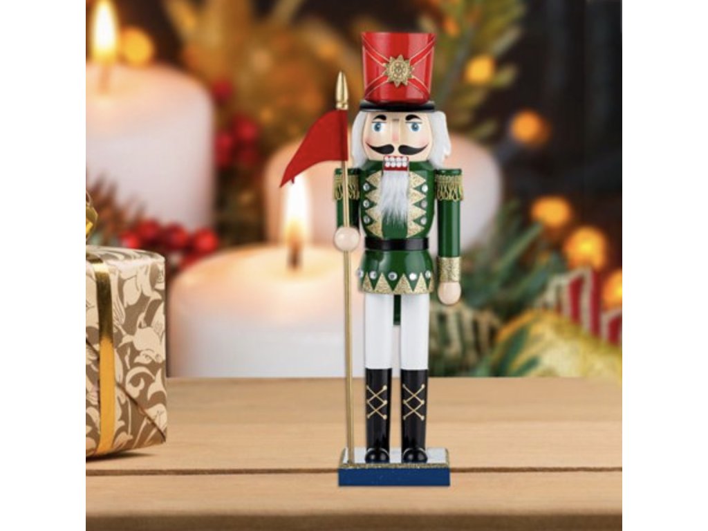 Louskáček jako voják s červenou vlajkou o výšce 39 cm je ručně vyráběný a malovaný skvost, který zaujme každého milovníka vánoční atmosféry. Tento kvalitní dřevěný kousek není jen ozdobou, ale i praktickým pomocníkem při louskání ořechů během svátečních chvil.