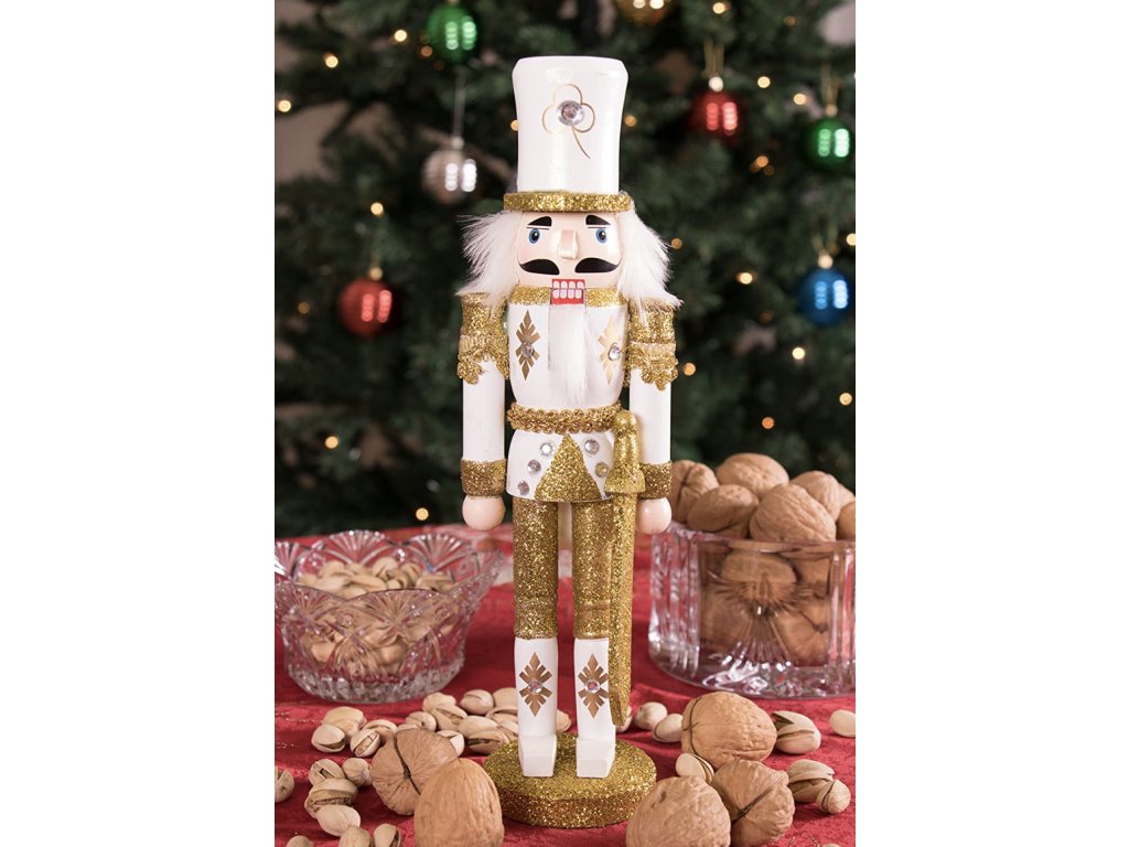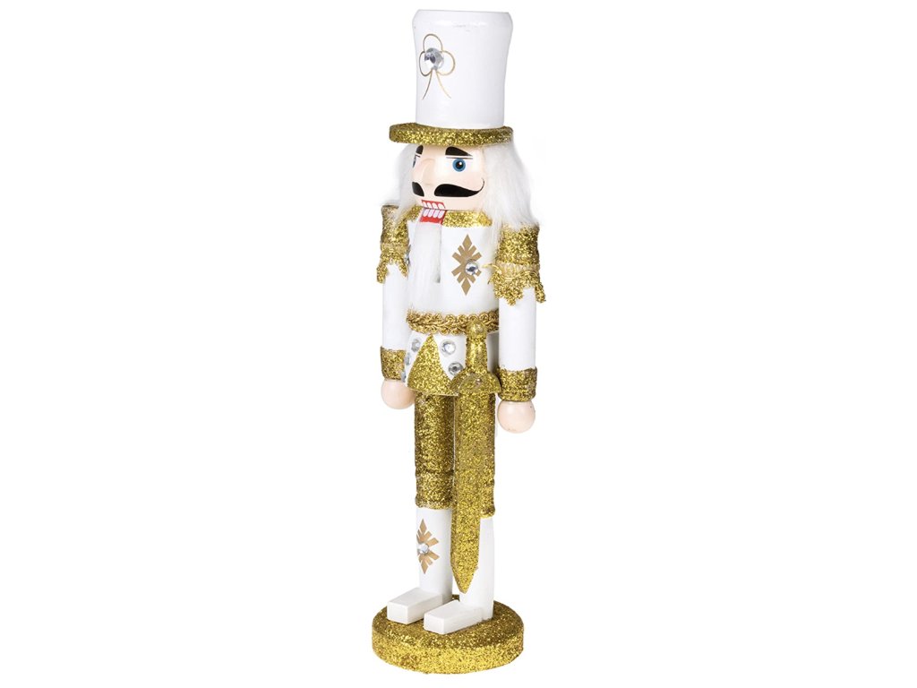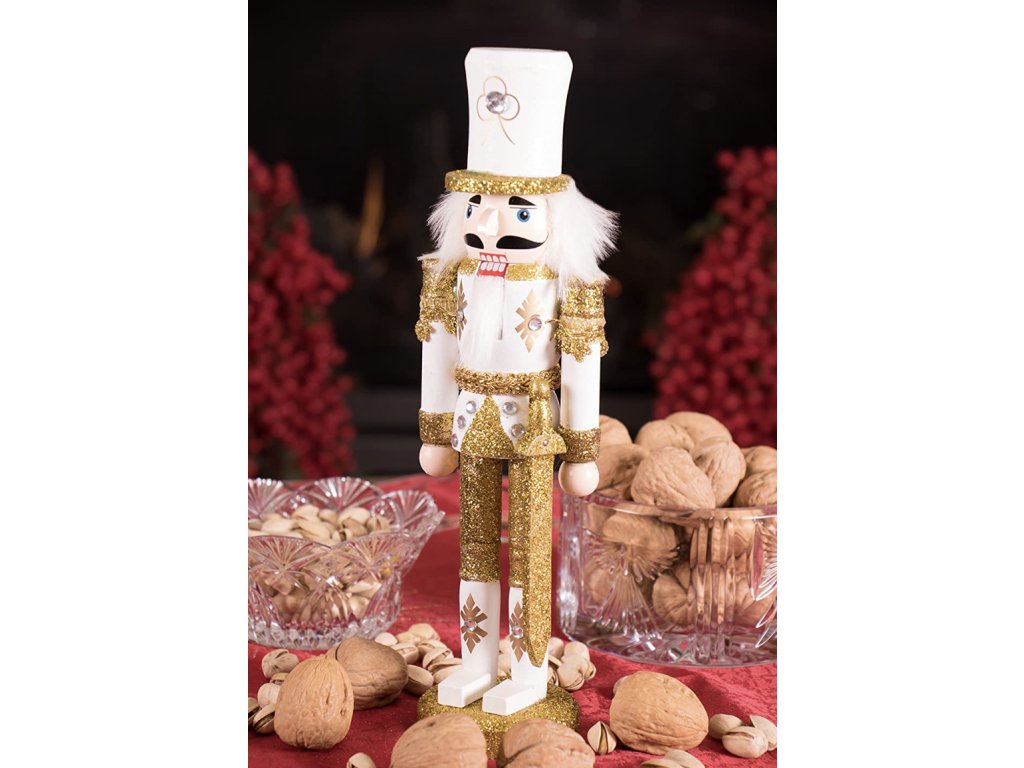 Přivítejte sváteční sezónu s unikátním louskáčkem, který okouzlí svou bílou a zlatou uniformou a důstojnou postavou vojáka se šavlí. Tento ručně vyráběný a ručně malovaný louskáček o výšce 30 cm je nejen krásnou dekorací, ale také praktickým pomocníkem při louskání ořechů. Je ideální volbou pro ty, kdo hledají spojení tradice a elegance na vánočním stole či poličce.