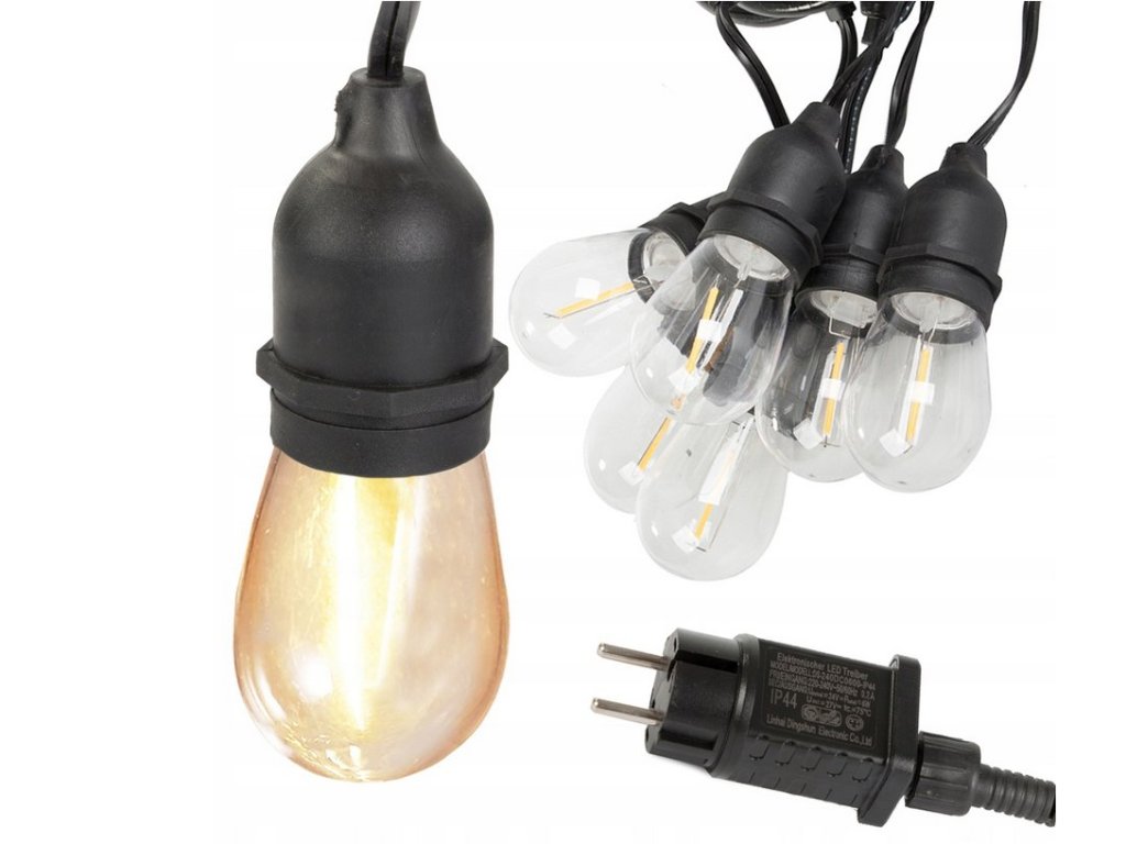 Girlanda obsahuje 10 LED žárovek s háčky pro jednoduché zavěšení. Každá žárovka je opatřena krytím IP65 (tělo) a IP44 (žárovka), což zaručuje odolnost vůči vlhkosti a prachu. Délka osvětlené části je 5 metrů, k níž navazuje přívodní kabel dlouhý 1,5 metru v elegantní černé barvě. Výkon spotřebiče je pouze 10W, přičemž doporučená doba svícení je 10-12 hodin denně, s životností přesahující 3000 hodin.