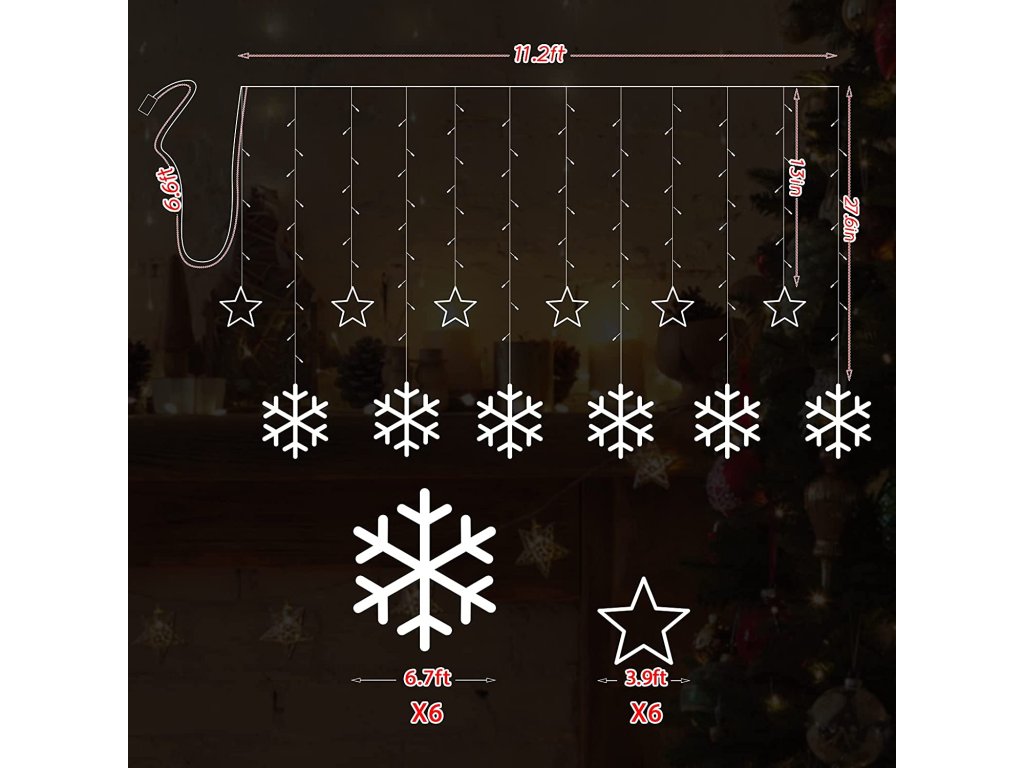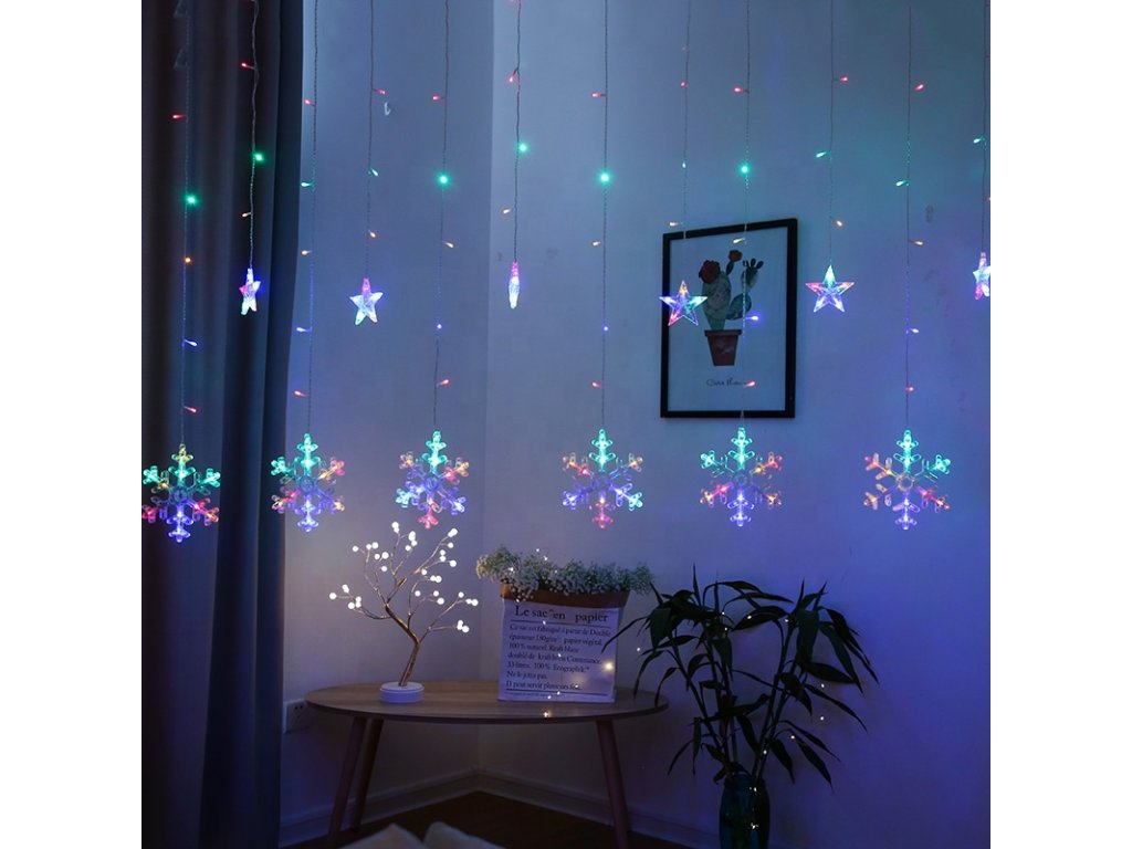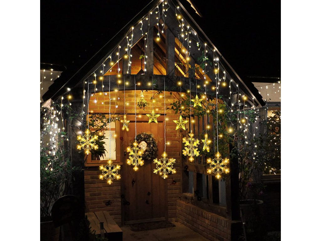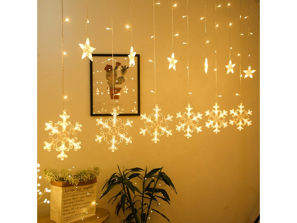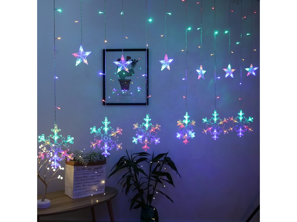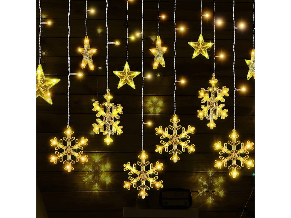 Vnitřní vánoční LED závěs - Hvězdy s vločkami 3m (138 LED)