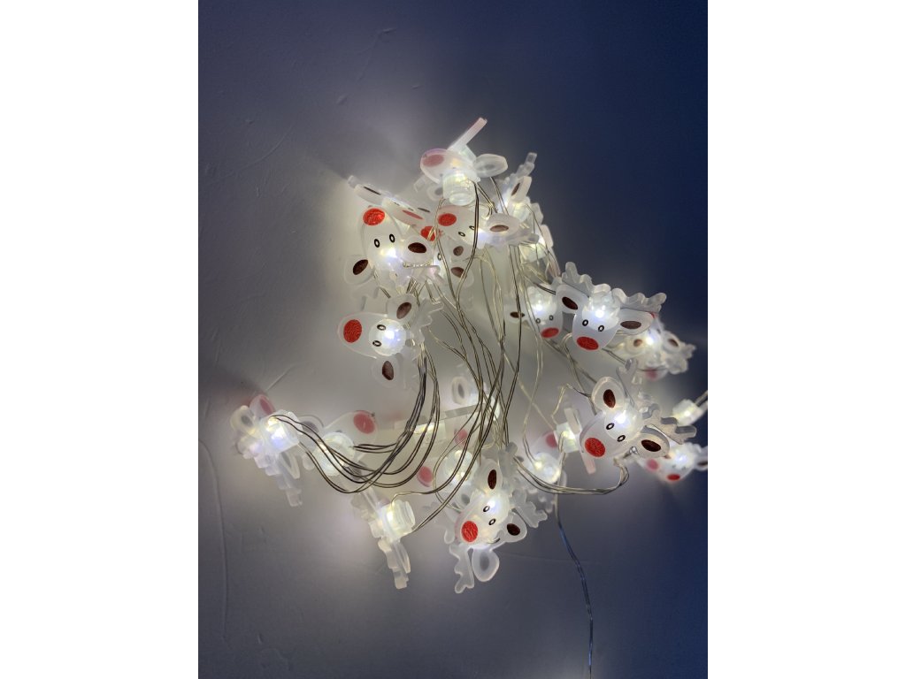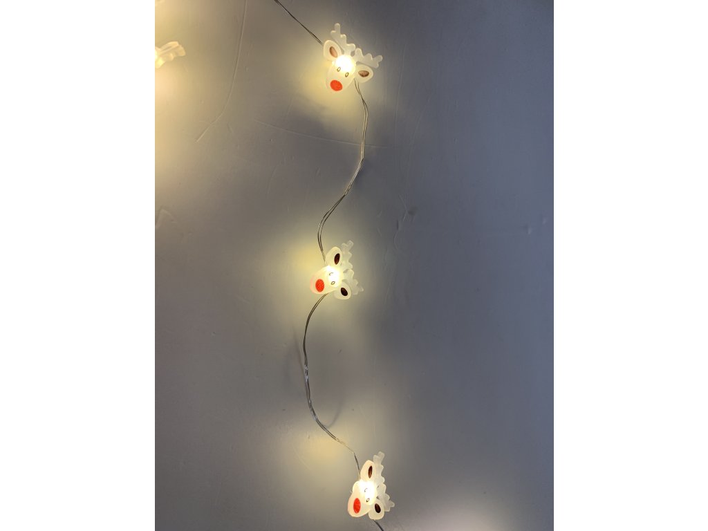Světelný řetízek je tvořen tenkým kovovým drátkem z kombinace kovu a plastu, který je pružný a snadno přizpůsobitelný jakékoliv dekoraci. Diody jsou ve tvaru roztomilých sobích hlaviček, což dodává ozdobě originální a sváteční charakter. Rozestup mezi LED je pravidelný, 10 cm, přičemž první dioda je vzdálena 10 cm od zdroje, což zajišťuje rovnoměrné osvětlení.