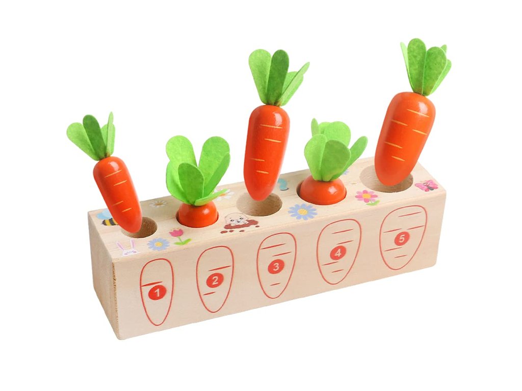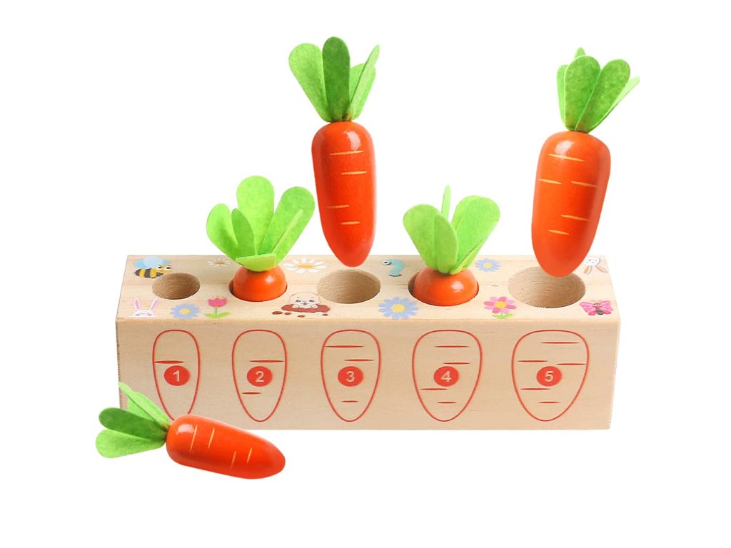 Tato hra na sklizeň mrkve nabízí různé velikosti zeleniny, které pomáhají dětem rozvíjet jemnou motoriku, koordinaci ruka-oko i schopnost třídění a rozpoznávání tvarů. Malé ručičky si procvičí lízání a manipulaci s jednotlivými díly, což přispívá k lepšímu soustředění a trpělivosti.